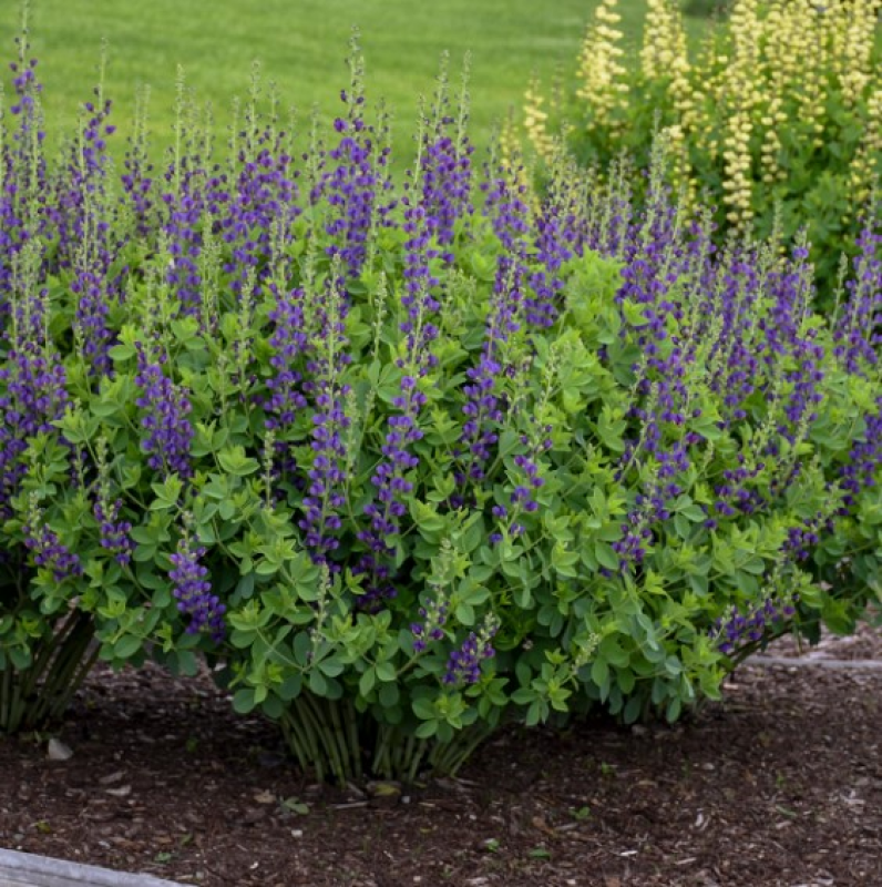 Vivid violet blue flowers appear atop a compact, upright clump of deep blue-green foliage in spring. Smaller size good for compact locations. Unique seed pods great for dried arrangements. Great for xeric locations.