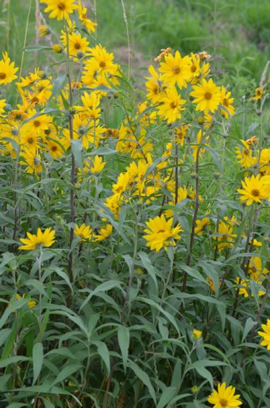 The leaves of the Maximilian sunflower are long and narrow. They are alternate, coarse and hairy, slightly wavy on the edges, often folded lengthwise, slightly toothed, and very pointed. Numerous yellow flower heads grow on their own stalks. The flower head is up to 5 inches across.