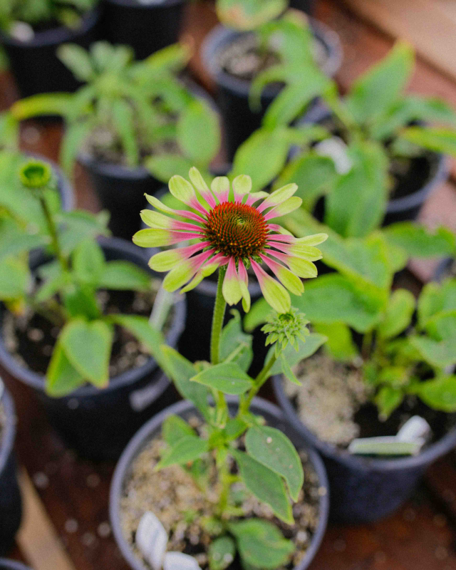 The 'Green Twister' coneflower, a cultivar of Echinacea purpurea, is a distinctive and eye-catching perennial known for its unique bi-colored flowers. This plant is easily recognized by its large, single daisy-like blooms with an unconventional color palette. The petals display a striking gradient, starting with a vibrant chartreuse or lime green at the tips and transitioning to a deep carmine or magenta red near the central cone.