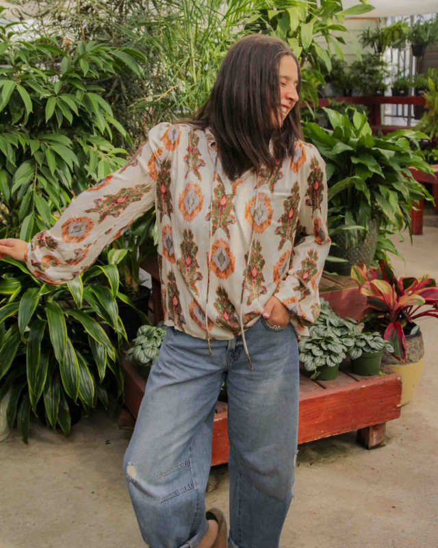 Embrace bohemian elegance with the Mystree Ivory & Tribal Printed Peasant Blouse. This airy, comfortable top captures a free-spirited aesthetic with intricate detailing and a soft, flowy silhouette. Adorned with a captivating tribal print in earthy tones, often accented by delicate embroidery or tassel ties at the split neckline.