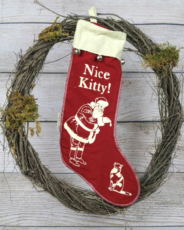 This charming "Nice Kitty" stocking from Primitives by Kathy is the perfect addition to your holiday decor. Featuring a cute kitty design and a festive red and white color scheme, this stocking is sure to bring holiday cheer to your home. Hang it on your mantle or by the fireplace to create a cozy and inviting atmosphere.