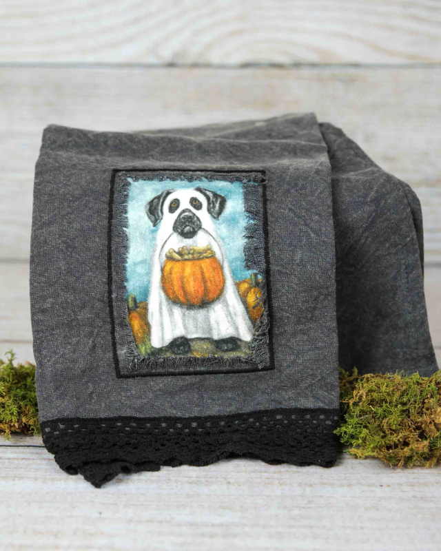 Add a touch of spooky charm to your kitchen with the Ghost Dog Halloween Kitchen Towel from Primitives by Kathy. This adorable towel features a stitched art panel of a dog dressed up in a ghost costume, holding a pumpkin treat bucket. The design is set against a stonewashed black background and accented with black lace trim, creating a vintage-inspired look.