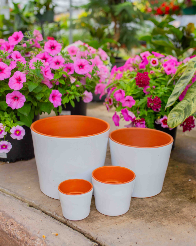 The Deroma Cabo is a flared terracotta pot designed for indoor and outdoor use. It features a modern, rimless shape and a two-tone finish, providing a contemporary update to the traditional clay planter.