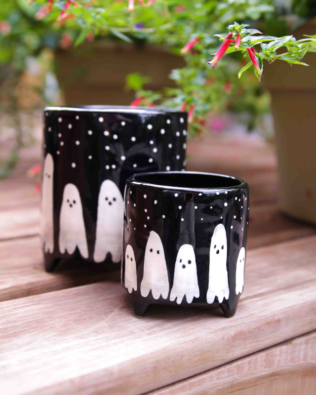 The Boo Pot is a popular item for those looking to "dress up their plants" for Halloween! The pot itself is a deep, shiny black and the ghosts are hand-painted in a crisp, clean white. The pot is also footed with 4 small feet that elevate the pot.