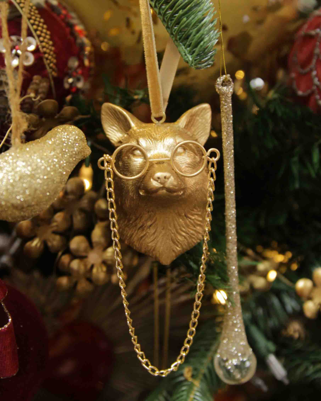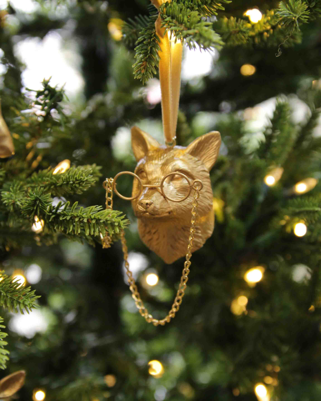 Embrace the quiet elegance of the woodland with Eloise the Fox ornament, a sophisticated centerpiece from the beloved Eric & Eloise Collection by artist Jessica Hiemstra. Eloise, the titular fox, embodies grace and wisdom. This particular rendition is finished in a luxurious gold, highlighting her keen features and the distinguished glasses she wears.