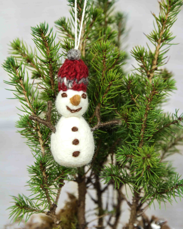 This adorable snowman ornament from Gry & Sif is the perfect way to add a touch of winter cheer to your Christmas tree. Handcrafted from soft felt, this charming snowman features a bright red hat and a friendly smile. His simple design makes him a versatile decoration that can be displayed in various settings, from the mantelpiece to the windowsill.