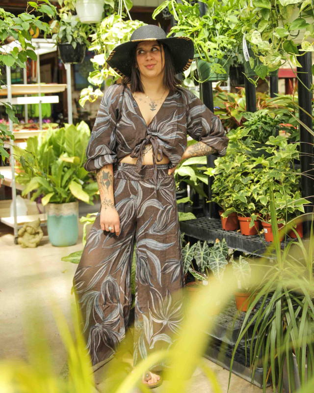 This coordinated set from Tempo Paris features a bold, botanical leaf print in a muted earth-tone palette. Made from a lightweight, textured fabric, it offers a relaxed and breathable fit for warm-weather styling.