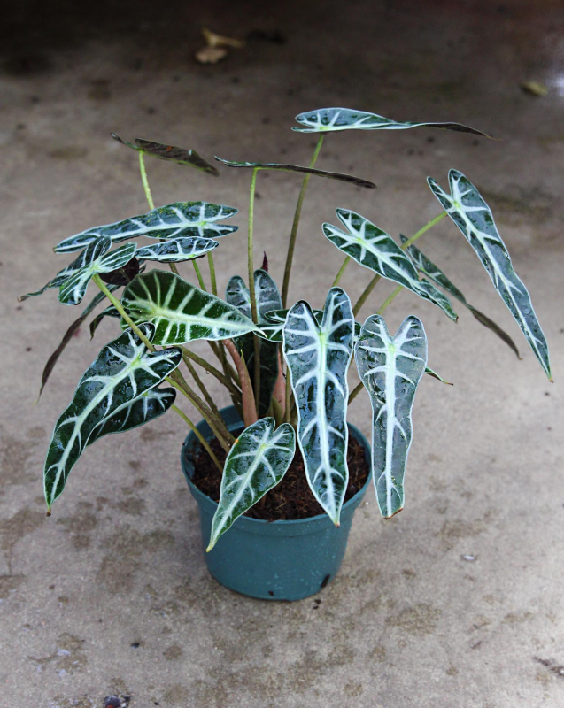 Alocasia amazonica, or Alocasia Bambino, is a great beginner tropical houseplant known for its dark, arrowhead leaves with wavy edges. These glossy, emerald leaves have a purple hue underneath and minty venation on the surface perched on top of tall petioles. It is the perfect houseplant to liven up your office or side tables!