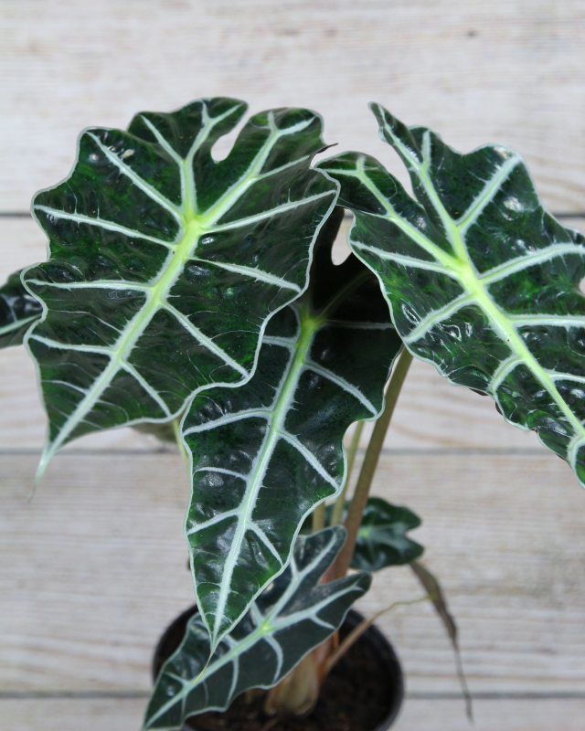 Alocasia houseplants are subtropical plants that are well known for their remarkable foliage, especially Alocasia Polly. The large, arrow shaped leaves have a glossy texture with wide silver veins. These cultivars can range in size from 2 feet tall to 6 feet tall and some can spread nearly 5 feet wide. At Bath Garden Center, you'll find an assortment of Alocasia waiting to find their new home with you!