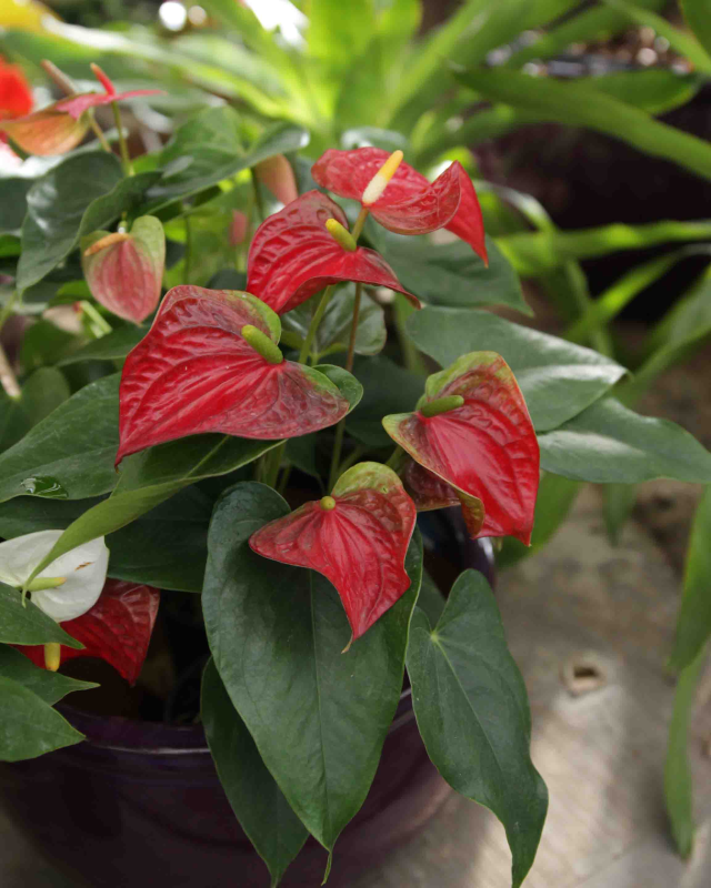 The Anthurium andraeanum, commonly called Flamingo Lily or Painter's Palette, is an epiphytic tropical evergreen that is most noted for its attractive waxy foliage and bright red spathes/flowers.
