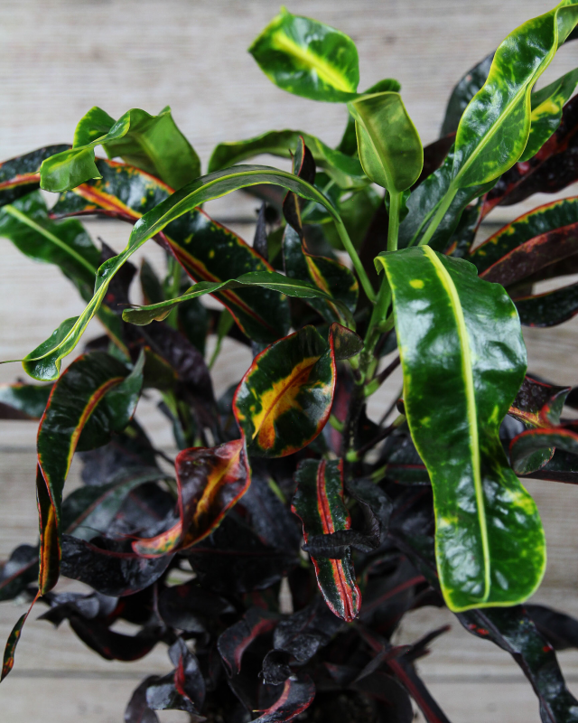 Croton 'Mammy' is a common houseplant most recognizable by its striking foliage. The brilliant colors of this cultivar can range from green variegated with white, pink, orange, yellow, red, or purple in various combinations that may change as the leaf ages. The leaves are thick and leathery and may twist and curl as they grow.