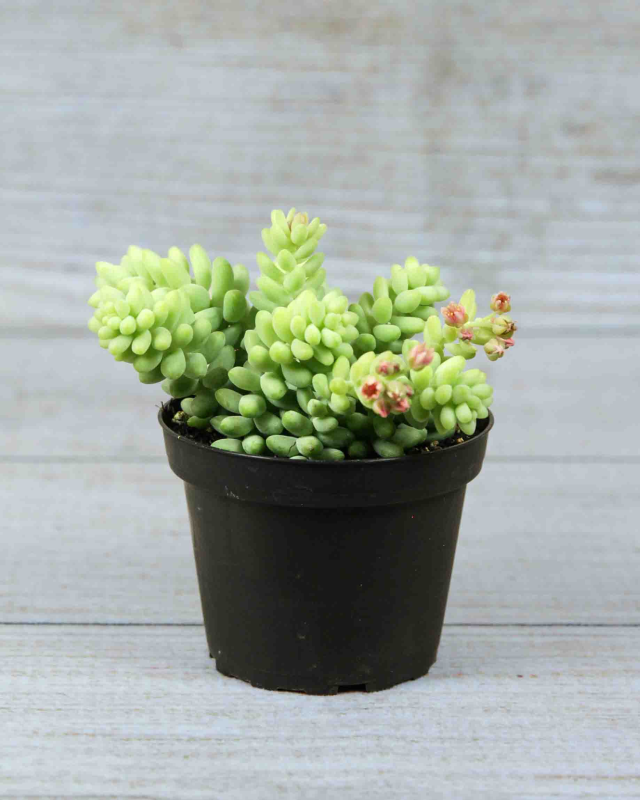 The Donkey Tail succulent, also known as Sedum morganianum, is a captivating succulent prized for its cascading, teardrop-shaped leaves. The leaves are a vibrant blue/green and often dusted with a powdery blue waxy coating called farina. This coating helps protect the plant from sun and excessive moisture loss.