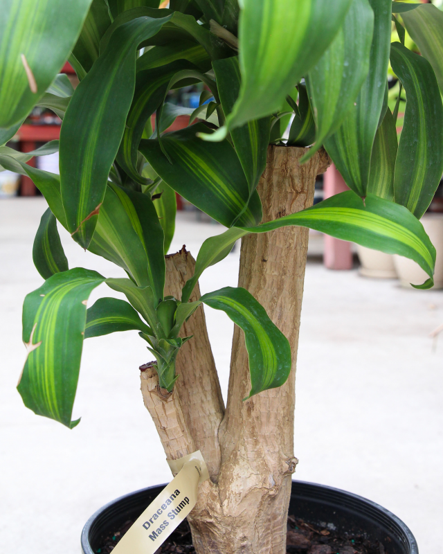 The Dracaena massangeana 'Mass Stump' is a unique and untraditional variety of the Dracaena 'Mass Cane'. This houseplant is known for its upright growth and stylish dark green leaves striped with a lime green center. The Mass Stump is shorter than the Mass Cane, about 4-6 feet tall, and is great for a naturally lit space.