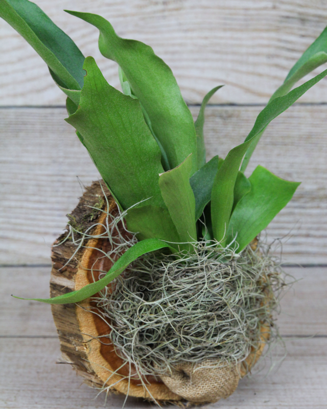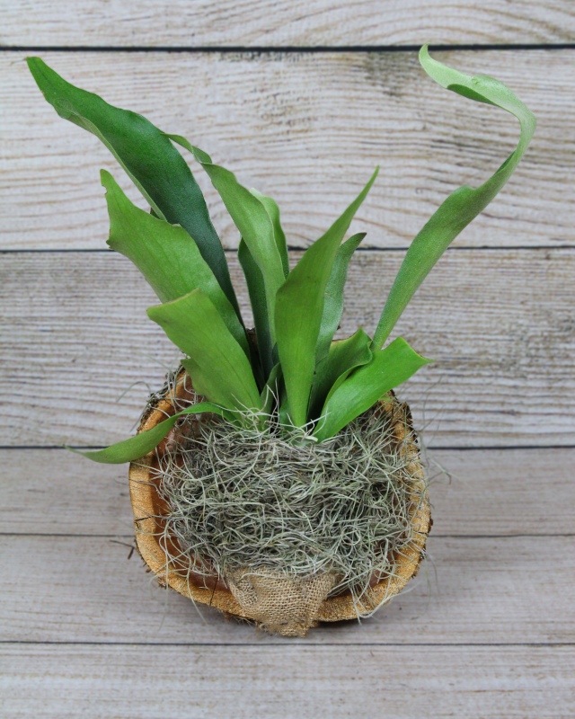 The Platycerium bifurcatum, also known as a Staghorn Fern, is a distinctive epiphytic species that produces leathery, forked fronds resembling the horns of a stag and are covered in a velvety covering of white hairs. This mounted variety hangs perfectly on a wall that gets plenty of bright, indirect light.