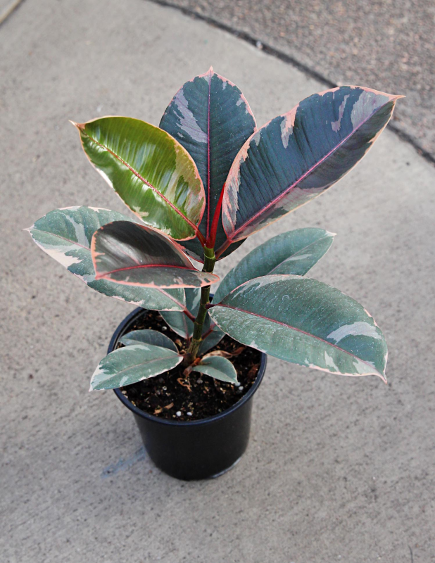 The Ficus elastica 'Ruby' is a variegated Rubber Plant. It is an evergreen tree species that produces oval, glossy, leathery leaves that are mint green with white edges and a flush or red or pink. An excellent air purifier.
