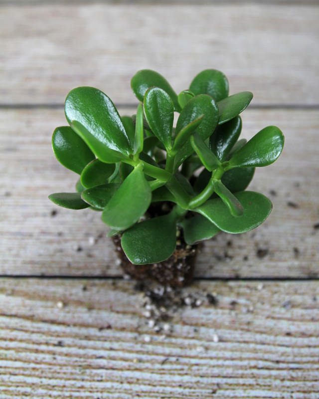 Crassula ovata, commonly referred to as a Jade plant, is an easy-to-grow succulent shrub with smooth, rounded, glossy, egg-shaped leaves clustered along thick succulent branches.