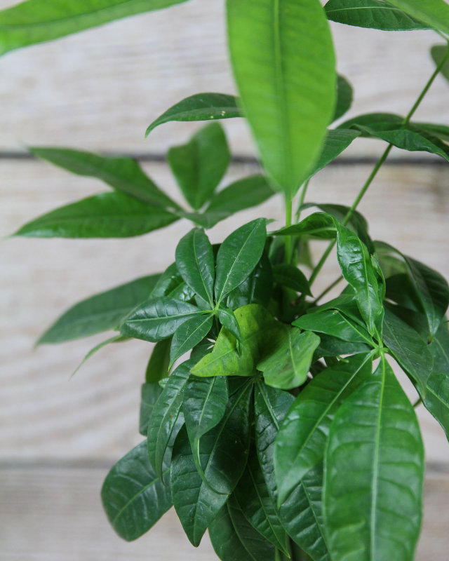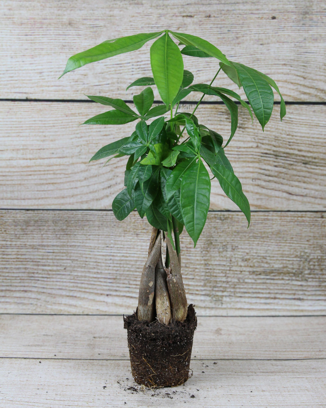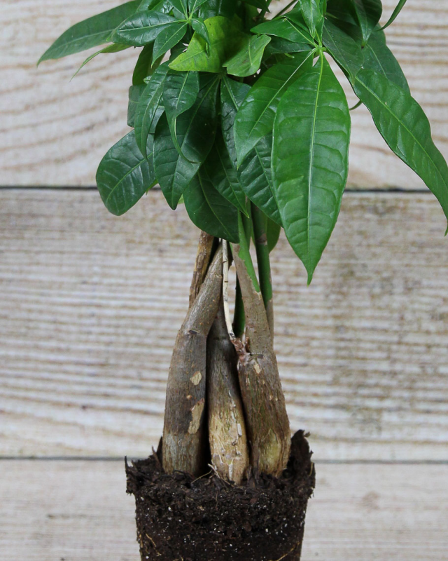 The Money Tree, also known as the Pachira Fortune Tree, is a symbol of luck and prosperity. Its bark is gray and smooth and the trunks of money trees are often artistically braided. The slim stems contain 5-7 glossy green, palmate leaves and indoors they can reach 3-6 feet.