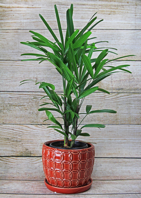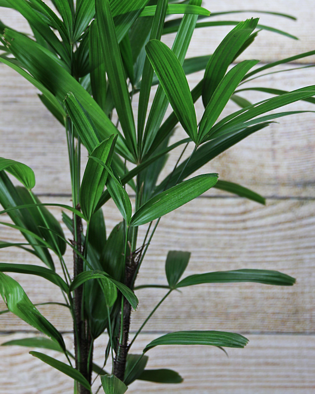 The Rhapis excelsa, commonly known as a 'Lady Palm' or 'Bamboo Palm', is an evergreen fan palm that grows in a dense clump of bamboo-like canes sporting green foliage with fan-shaped palmate leaflets diving into 5-8 narrow, finger-like segments.