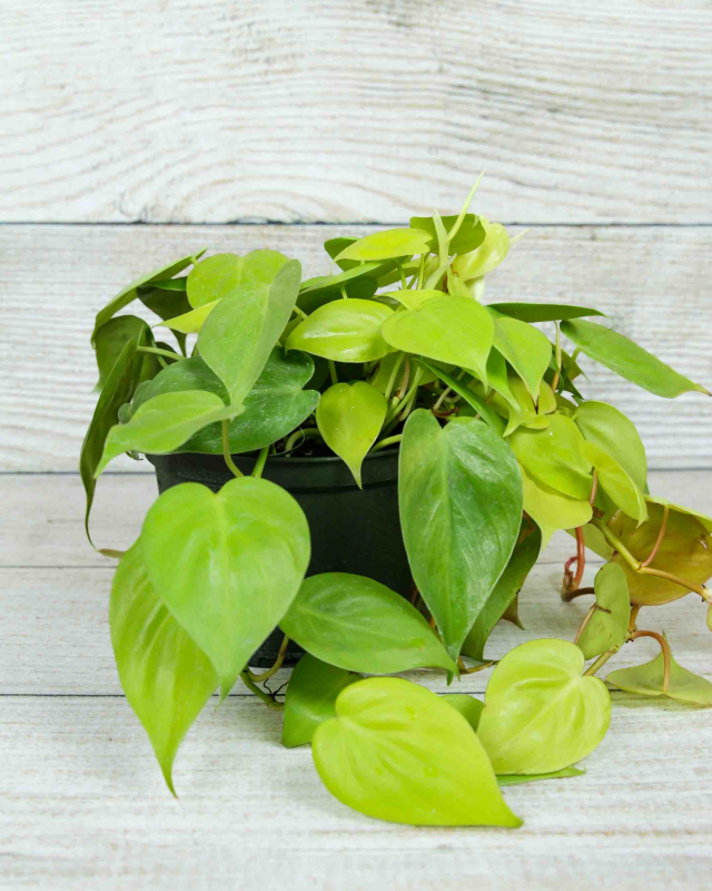 The Philodendron hederaceum 'Lemon Lime', or Lemon Lime Philodendron, is a variety of heartleaf Philodendron that features graceful tropical vines with leaves brilliantly colored yellow/green to lime green. This climbing Philodendron is evergreen and able to live indoors all year long. New growth may appear orange in color and transform to shades of neon green as the foliage matures.