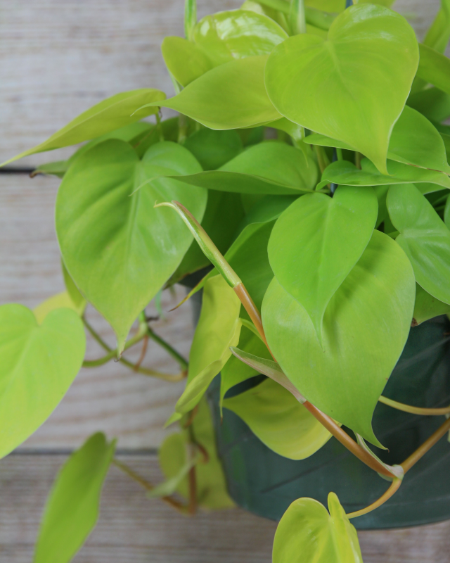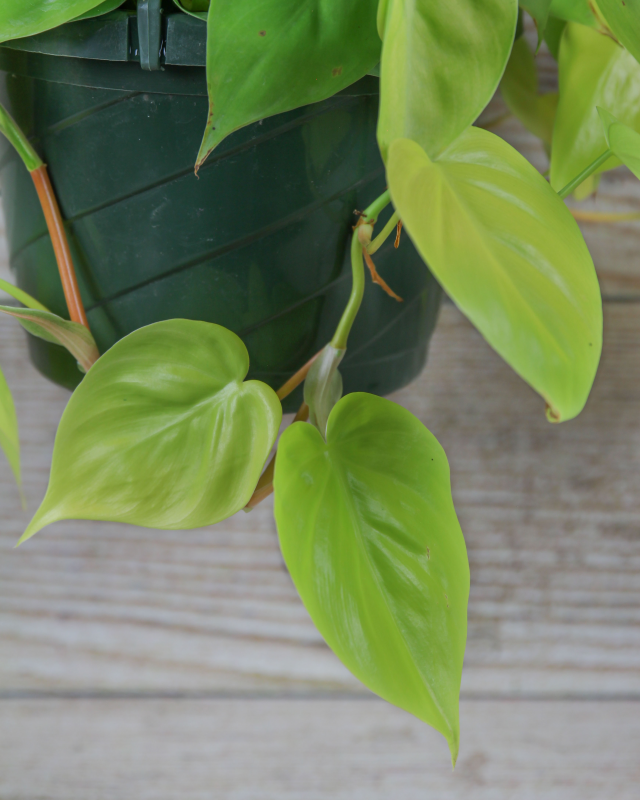 The Philodendron hederaceum 'Lemon Lime', or Lemon Lime Philodendron, is a variety of heartleaf Philodendron that features graceful tropical vines with leaves brilliantly colored yellow/green to lime green. This climbing Philodendron is evergreen and able to live indoors all year long. New growth may appear orange in color and transform to shades of neon green as the foliage matures.