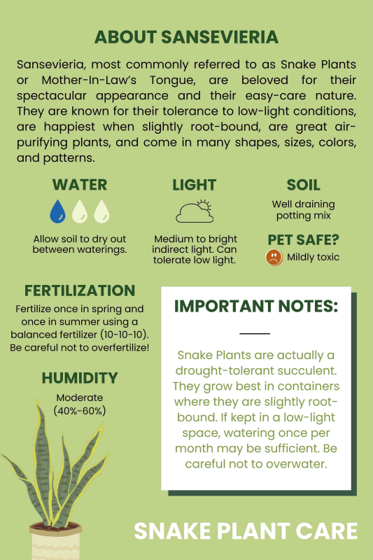 The Sansevieria trifasciata 'Laurentii’, also known as a Snake Plant or Mother-In-Law’s Tongue, is an evergreen perennial with strap-shaped leaves that grow vertically with a slight twist. Each leaf has varying colors and patterns, many of which mimicking the look of scales on a snakes back.
