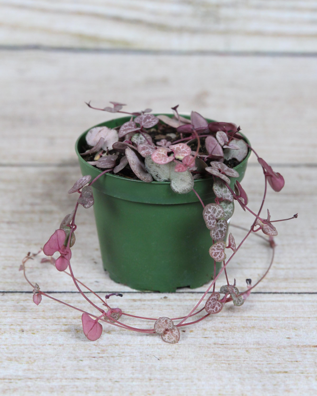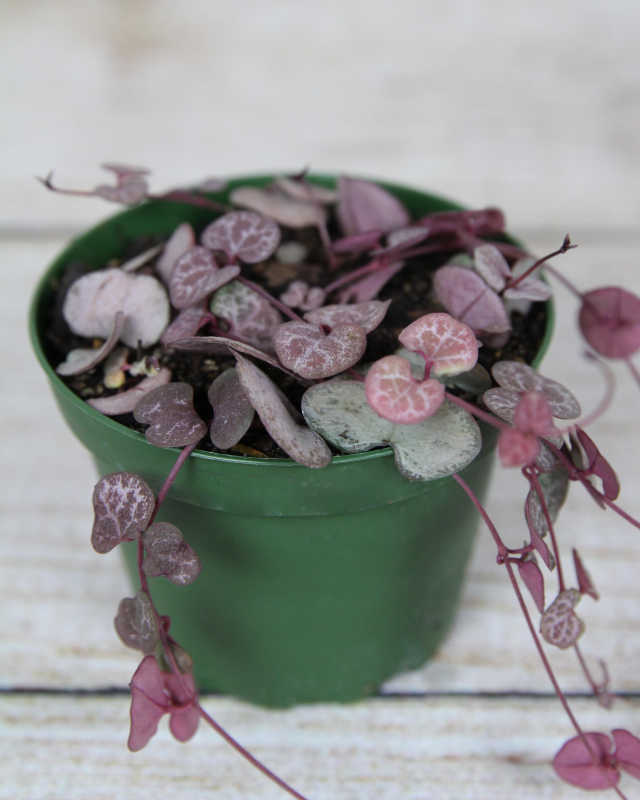 The String of Hearts houseplant (Ceropegia woodii) is a true botanical treasure. This charming beauty features cascading vines adorned with delicate heart-shaped leaves, creating a captivating display that will mesmerize any onlooker. it is commonly found planted in a hanging pot, which allows the vines to trail over the edge. Easily adaptable to a standard pot as well! Caring for the String of Hearts is a breeze, making it an ideal choice for both novice and experienced plant enthusiasts.