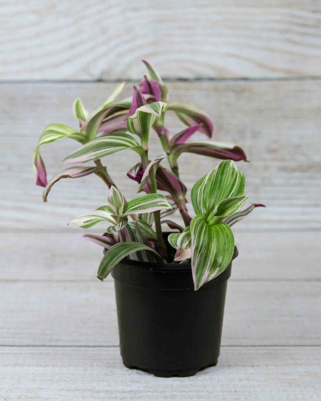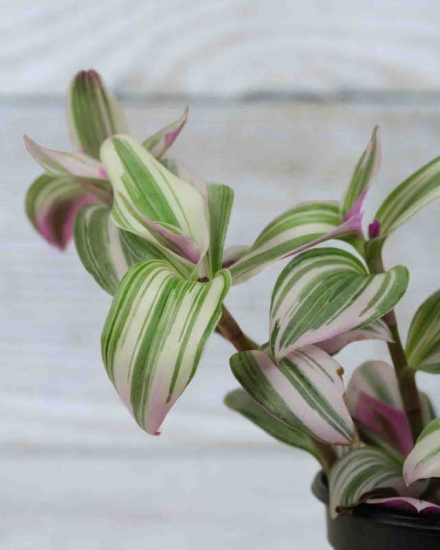 The Tradescantia nanouk plant, commonly known as a Spiderwort, is a vining houseplant that can be identified by its silvery-green and light purple striped leaves with purple undersides. This plant is easy to grow as a houseplant and in ideal conditions, the Tradescantia can produce pink, purple, or white flowers.