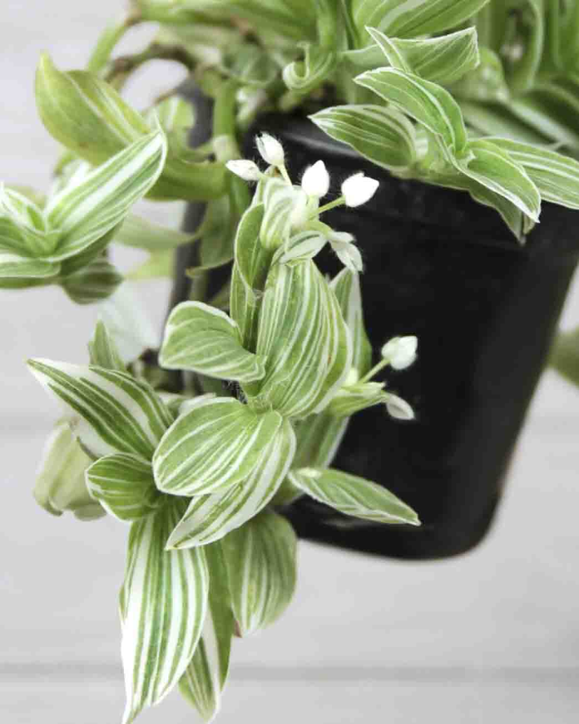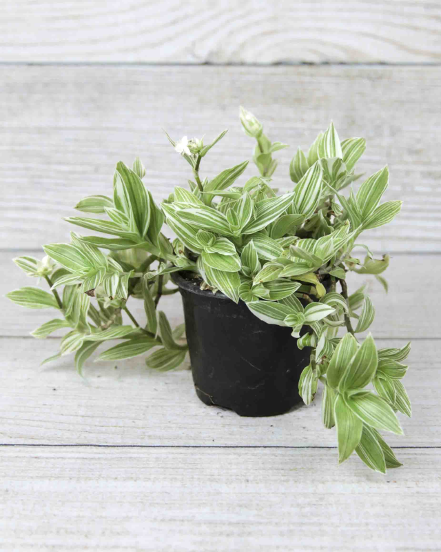 The Tradescantia sanna plant, commonly known as a Spiderwort, is a vining houseplant that can be identified by its silvery-green and light purple striped leaves. This plant is easy to grow as a houseplant and in ideal conditions, the Tradescantia can produce pink, purple, or white flowers.