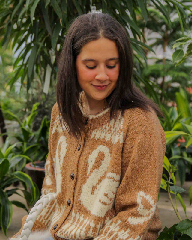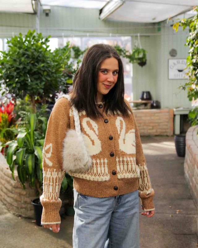Elevate your knitwear with a touch of whimsical elegance! The Blu Pepper Swan Jacquard Button Down is a charming and cozy piece that stands out from the crowd. Features a delicate swan motif intricately knit into the fabric, creating a subtle yet captivating texture and design. Styled as a full button-down, this piece offers the versatility to be worn as a lightweight cardigan or a standalone knit top.