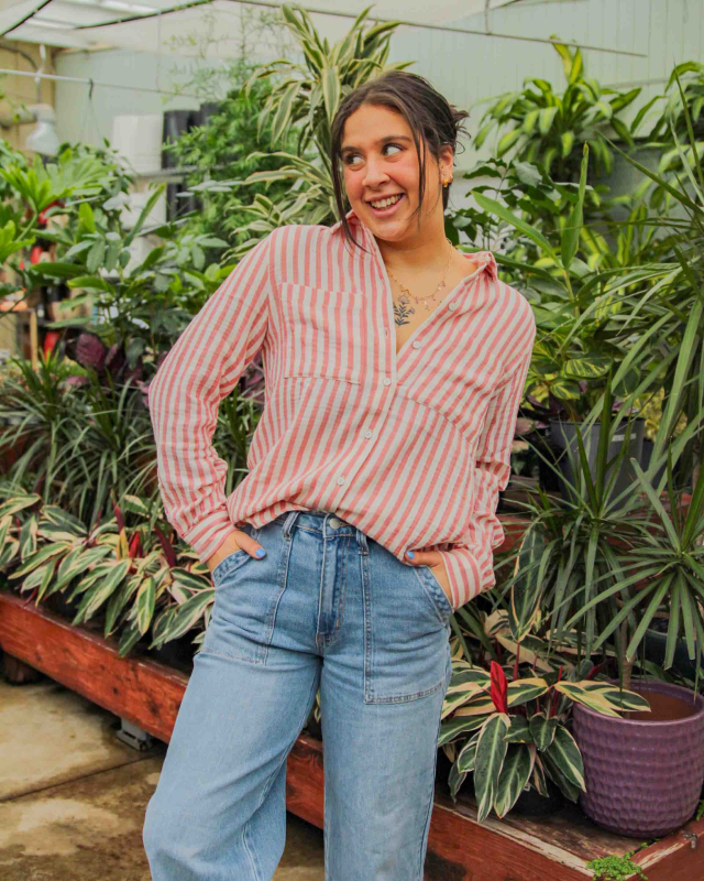 The ultimate marriage of preppy style and laid-back comfort, the Be Cool Striped Cotton Gauze Button Up in Pink and White is your new summer staple. This isn't your stiff office shirt—it’s a soft, textured essential designed to catch the breeze and keep you feeling refreshed from sunrise to sunset.