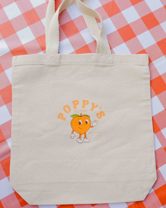 Grab a mini tote to haul your peaches and Poppy's accessories at our peach stand, located in our east parking lot. We're open daily!