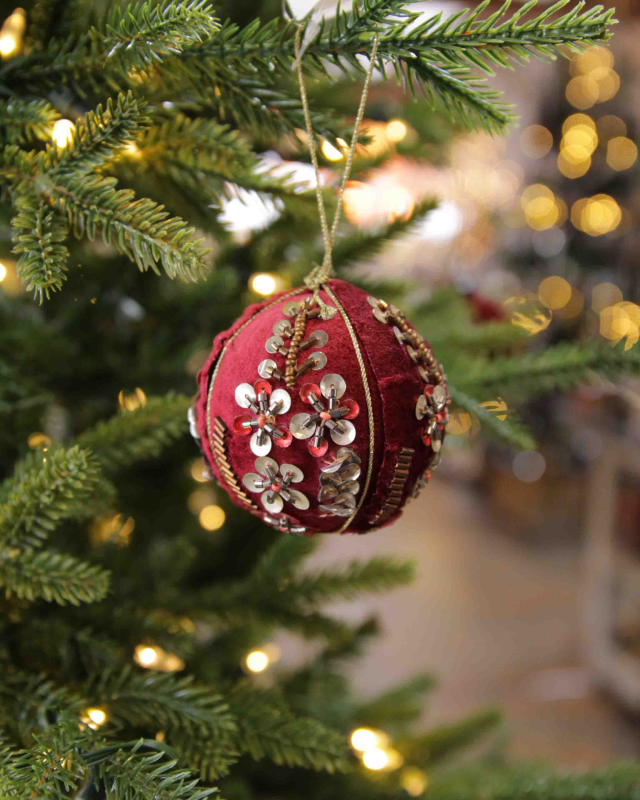 The Burgundy Beaded Velvet Ornament is a stunning addition to any holiday decor collection. Crafted from high-quality velvet, this ornament features a rich burgundy hue that adds a touch of elegance and warmth to your seasonal displays. Each ball is intricately adorned with delicate beadwork, creating a captivating texture that catches the light beautifully.