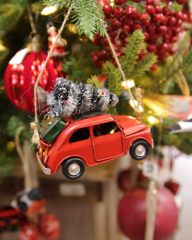 This charming ornament, a unique piece from the Shishi brand, captures the spirit of a classic holiday journey. It features a beautifully detailed, antique-style metal car. The metalwork is intricate, giving the car a lovely, weighty feel and an authentic, nostalgic look. Perched securely on the car's roof, as if just purchased from the tree farm, is a small, detailed Christmas tree.