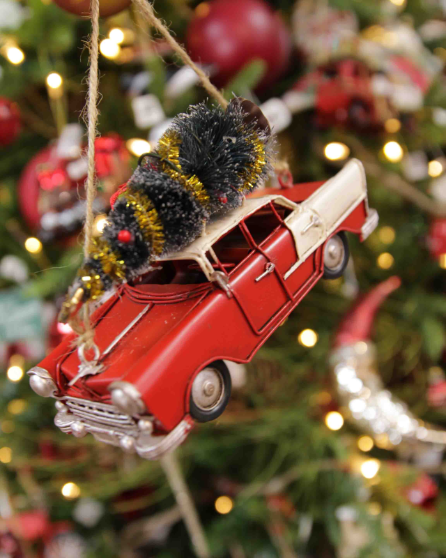 Take a nostalgic trip back in time with this charming Metal American Car Christmas Ornament from the renowned Shishi brand. This delightful piece features a detailed, vintage-style American car finished in a classic, cozy palette of cream and festive red. Perched securely on the roof, as if it just returned from the tree farm, is a miniature Christmas tree, completing the perfect holiday scene.