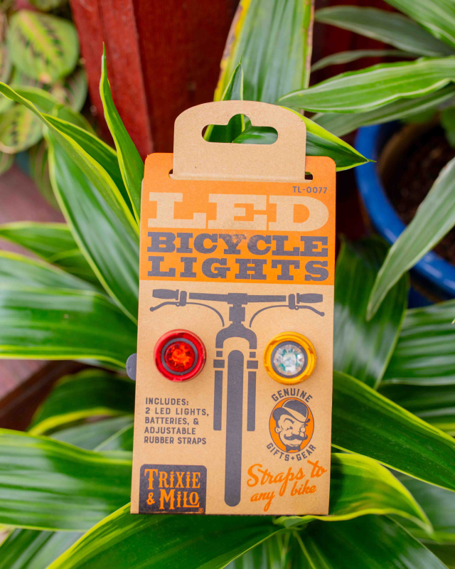 Ride safely with these two LED bicycle lights. Use on the front and back of your bike – a fantastic gift for any cyclist! Each light is attached to a quick-release rubber band for easy installation and includes two coin cell batteries. Includes 2 lights.