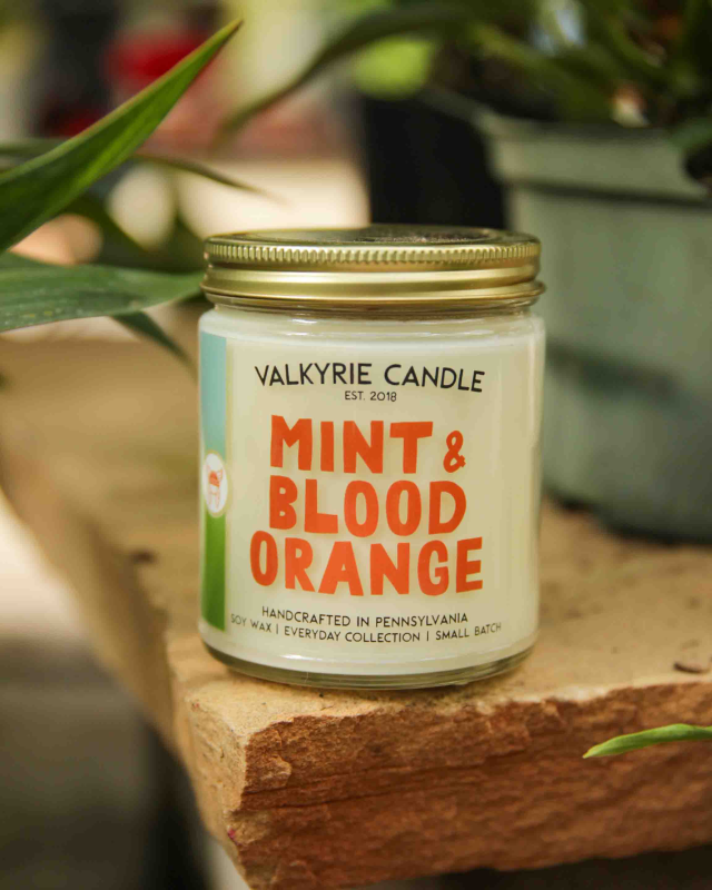 The Mint & Blood Orange Soy Candle by Valkyrie Candle is a citrus and herbal blend with notes of spearmint, eucalyptus, rose, bergamot, grapefruit, fennel, blood orange, green leaves, neroli, clean musk, and cedarwood. Hand-poured in small batches, this candle focuses on a clean-burning experience using natural materials.