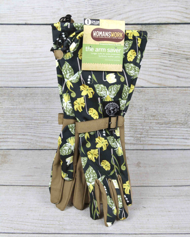 Crafted with comfort and protection in mind, these gloves feature extra-long cuffs that shield your arms from light scratches, pesky insects, and harmful sun exposure. The palms are reinforced with durable synthetic leather, providing a secure grip and added protection for your hands. These gloves feature a stretchy pull cord at the top that cinches the cuff around the arm. Woodland Garden print, designed by Portland, OR illustrator Kate Blairstone.