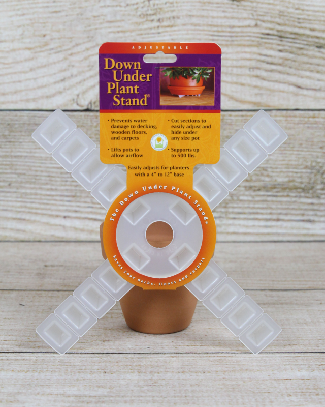 Down Under Plant Stands are a type of plant stand that is designed to lift potted plants off the ground, preventing staining and rotting on decks, patios, and other outdoor surfaces. The stands are made of durable plastic that is resistant to the elements, and they have a ventilated design that helps to prevent water from pooling under the pots.