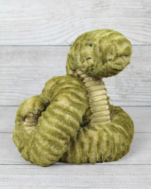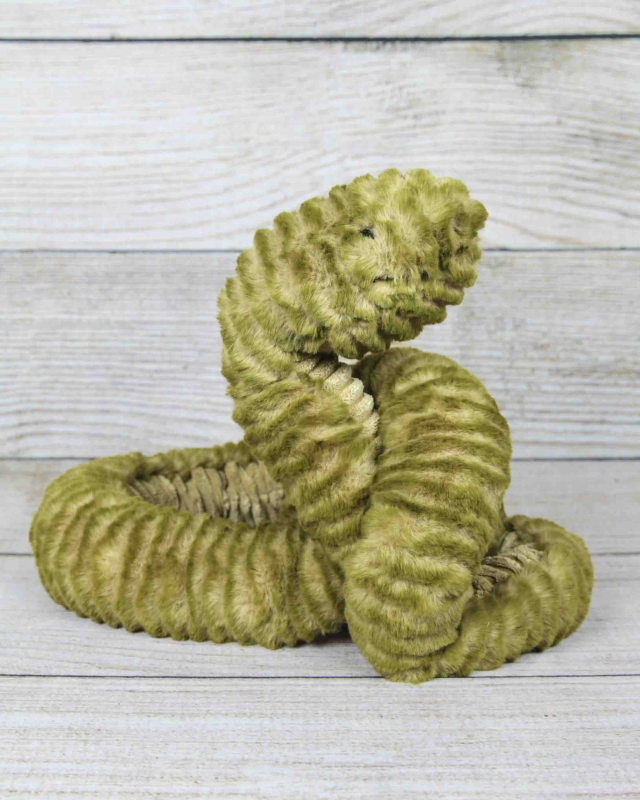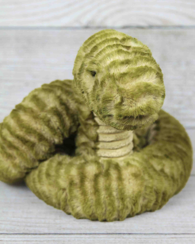 Slither Snake is looking mighty proud, and you would be too, with that ssssensational tail! He's a smiley snake with so much texture, from those soft, mossy ruffles to that biscuity, cordy tummy! Pull this slinky silly straight and he'll spring back into a coil again!