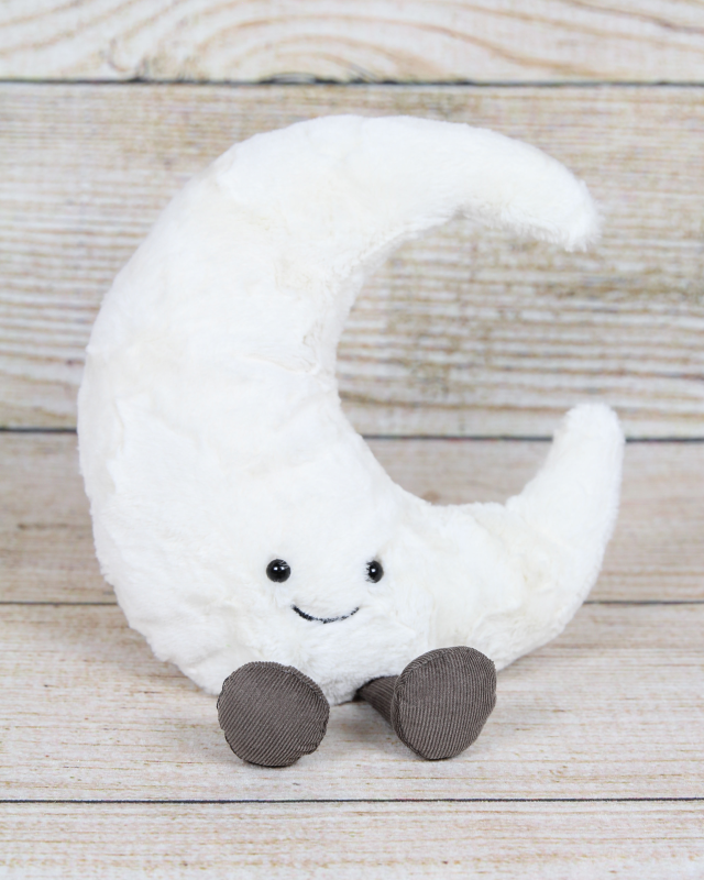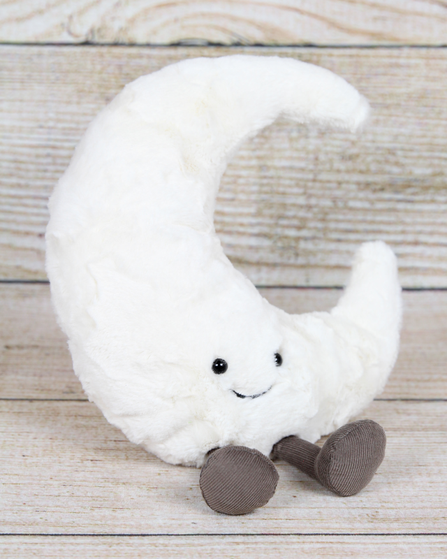 Embark on a celestial adventure with the Amuseables Moon by Jellycat! This plush companion brings the magic of the night sky to life with its soft, smiling face, adorably bright white crescent shape, and squishy cord booties. Its huggable size and lovable personality make it an ideal snuggle buddy for all ages. Bring home the enchantment of the Amuseables Moon and let your imagination reach for the stars.