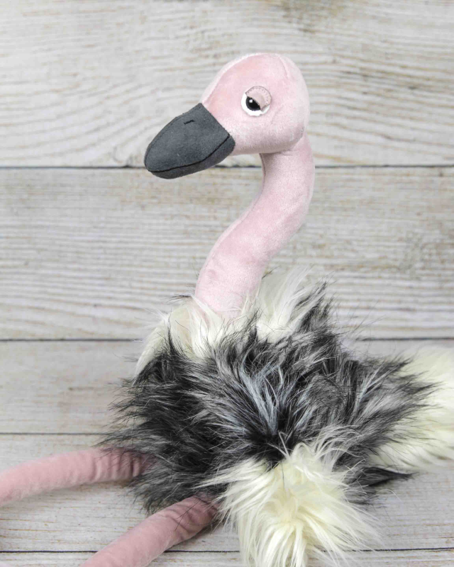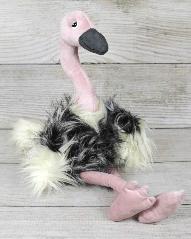 Why be modest when you could be magnificent? That's Ramonda Ostrich's motto. This elegant bird has a long sorbet neck, matching big feet and huge speedy legs! A cloud of swirling black and cream feathers, with dancing flecks and a suedey grey beak, Ramonda's stomping the runway!