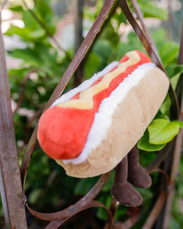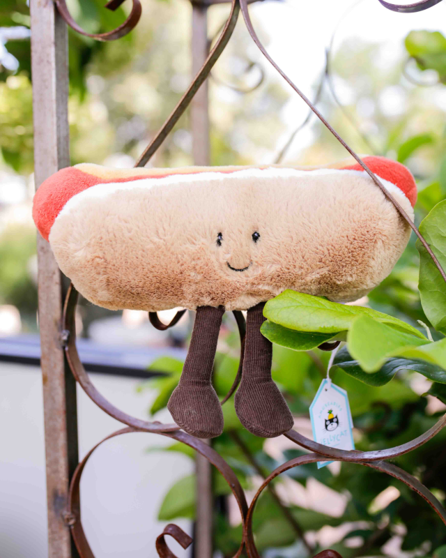 For summer fun, meet this silly sausage! Amuseables Hot Dog loves a trip to the fairground, trotting along on cordy feet. With a fluffy bread bun in beige and white fur and a gingery frankfurter covered in mustard, our smiley snack can't wait to try all the rides!