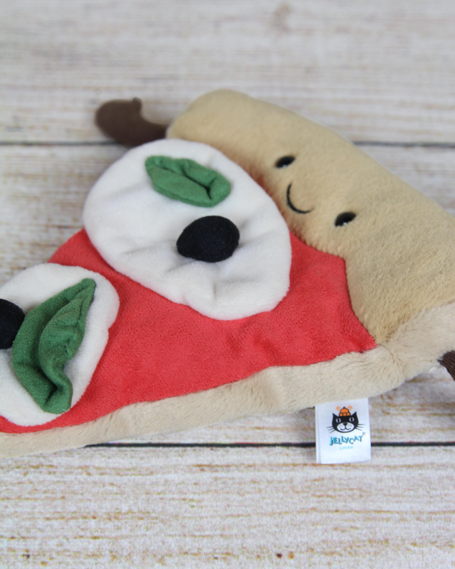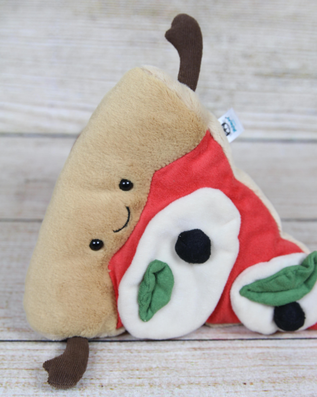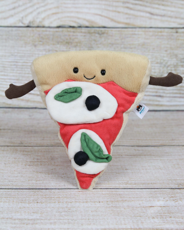From Naples to New York, everyone loves Amuseables Slice of Pizza! A wonderful wedge of yummy colors, this bold plushie is a movie-night maestro! With a soft two-tone crust, rich red marinara, creamy mozzarella, and suedey olives and leaves, as well as cordy arms for dramatic gestures, this is one prima pizza!