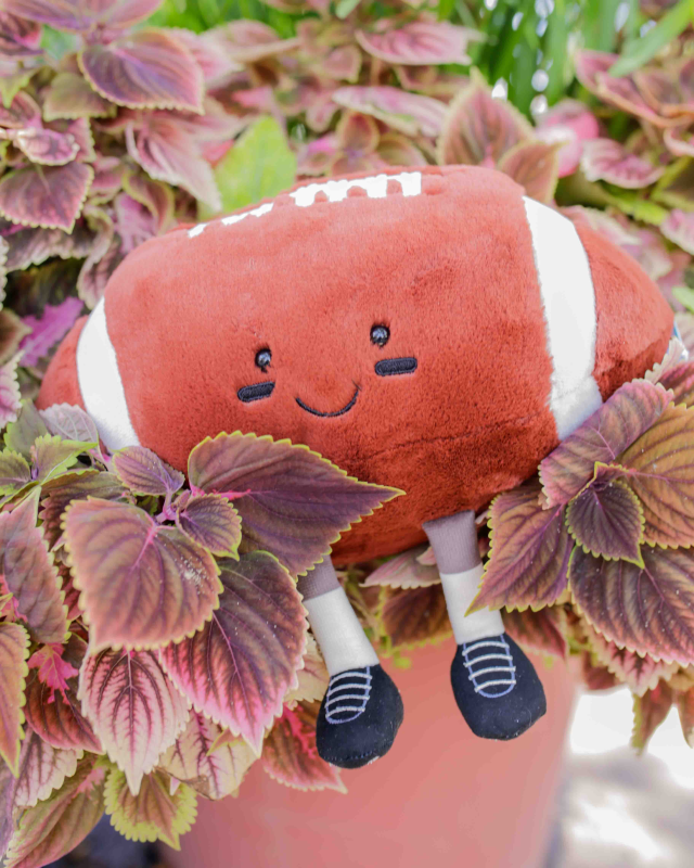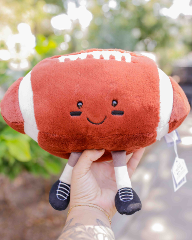 With silky soft tan-hued fur, cream suede lacing detail and soft stripes either end of this classically shaped sports favourite, Amuseables American Football is a captivating catch (and cuddle). Ready to run the field with a pair of cleats in suedette with embroidery details and fine cord socks, it's poised to be a league winner!