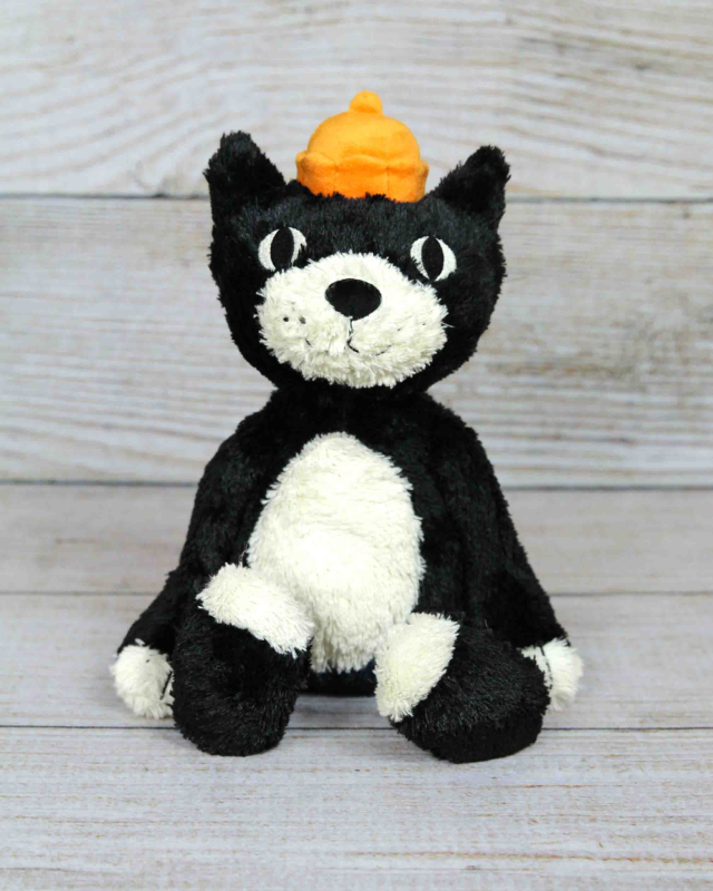 Jellycat Jack is finally here! This tuxedo cat has soft tufty fur, huge stitched paws and a friendly smile. With a long curved tail and L-shaped paws, Jellycat Jack has a soft velour crown of iconic orange jelly!