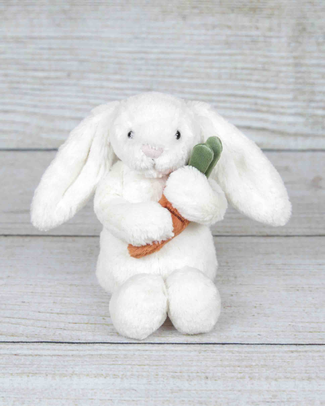 Bashful Carrot Bunny is keen to make friends and has brought as a gift their most prized possession: a tufty carrot with velvety shoots! This snowy bunny has long, soft ears, chunky paws and a fluffy tail, as well as a sugar-pink nose.