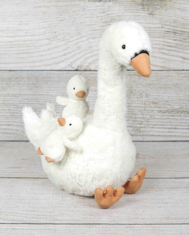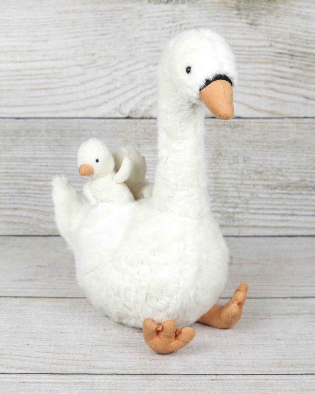 Featherful Swan is a very proud parent, protecting twin cygnets with their fluffy cream wings! This elegant swan has rich vanilla fur, set off by orange suedette feet and a matching beak with piping detail. The babies snuggled on their snowy back can pop out to explore by themselves!