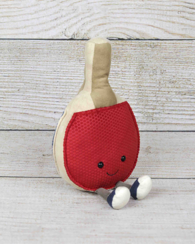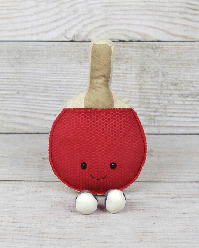 Amuseables Sports Table Tennis is gorgeously textured and ping-ponging with color! From that caramel-nougat suedette handle to those textured panels in red and blue โ and you canโt miss those cream-and-navy trainers, embroidered in vibrant red. To you!