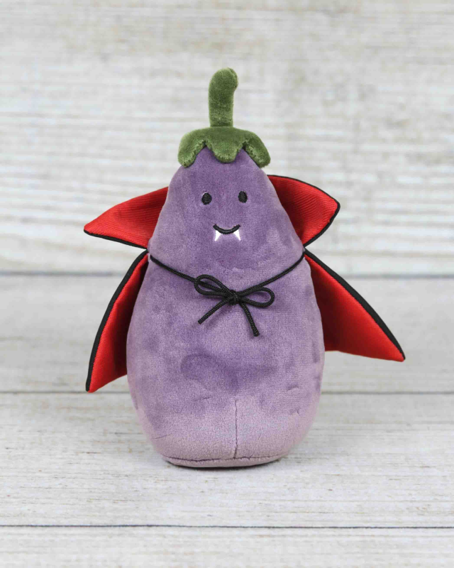 Sometimes vegetables bite back! Vivacious Eggplant Vampire is a stretchy purple spook with a black-and-red collared cape, tied with a cord. With a weighted base, green leafy crown and embroidered fangs, this veggie vampire is looking fierce!
