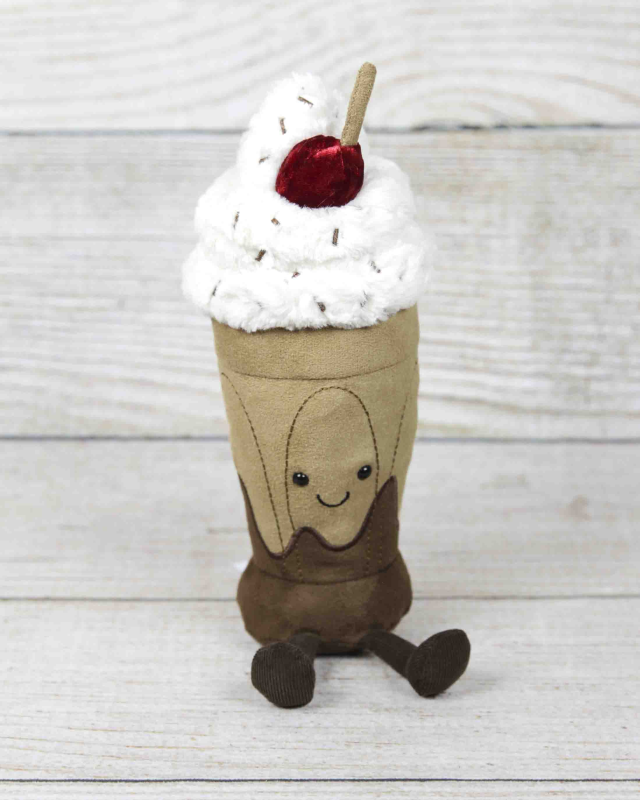Amuseables Marin Chocolate Milkshake brings all the cuddles to the diner. This suedette two-tone chocolate milkshake is topped with fluffy cream, stitched sprinkles and a velveteen cherry, with a stitched smile, and cocoa cordy legs.